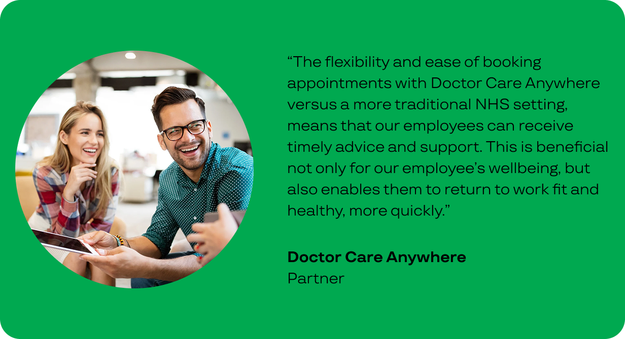 We partner with Doctor Care Anywhere to provide a simple and always-on option to book GP appointments for your team.